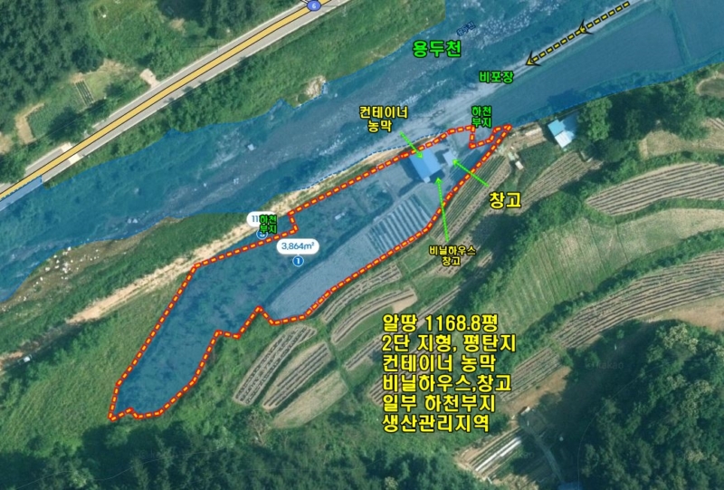 - 하천 및 하천부지 접한 토지로 마을과 떨어져 있는 농지,2차선 도로 및 버스정류장 450m