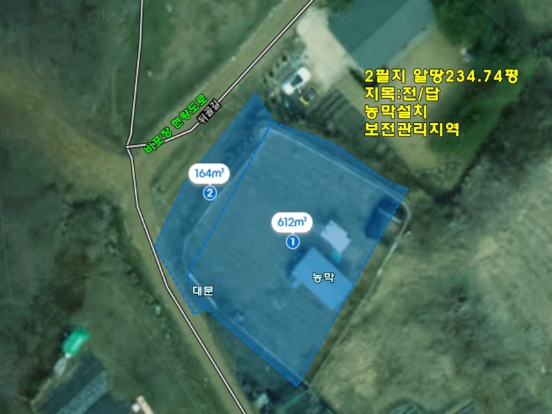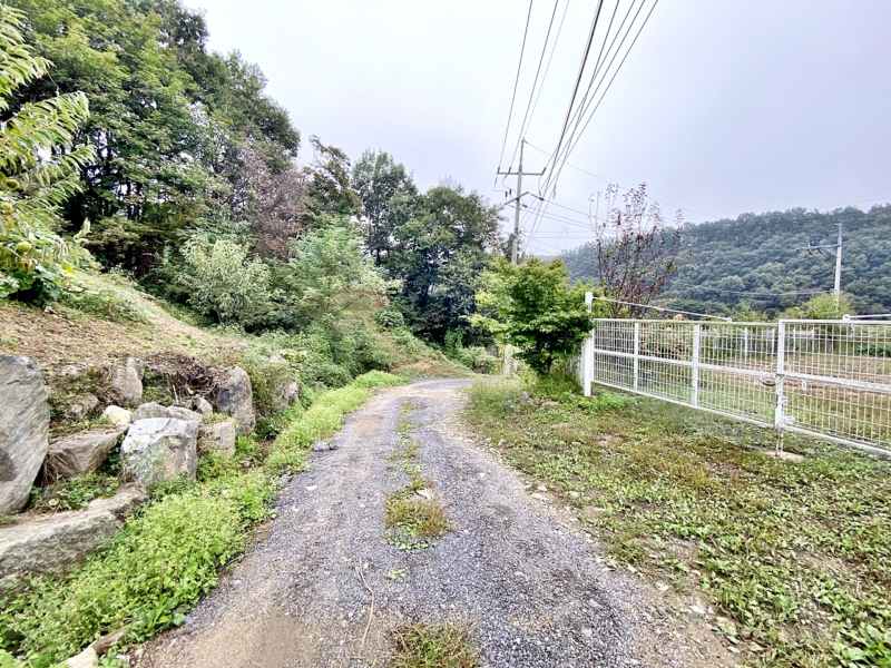 3m 비포장도로, 현황도로(타인 소유),소규모 전원 마을 상단에 위치,버스정류장 약 1.5km거리