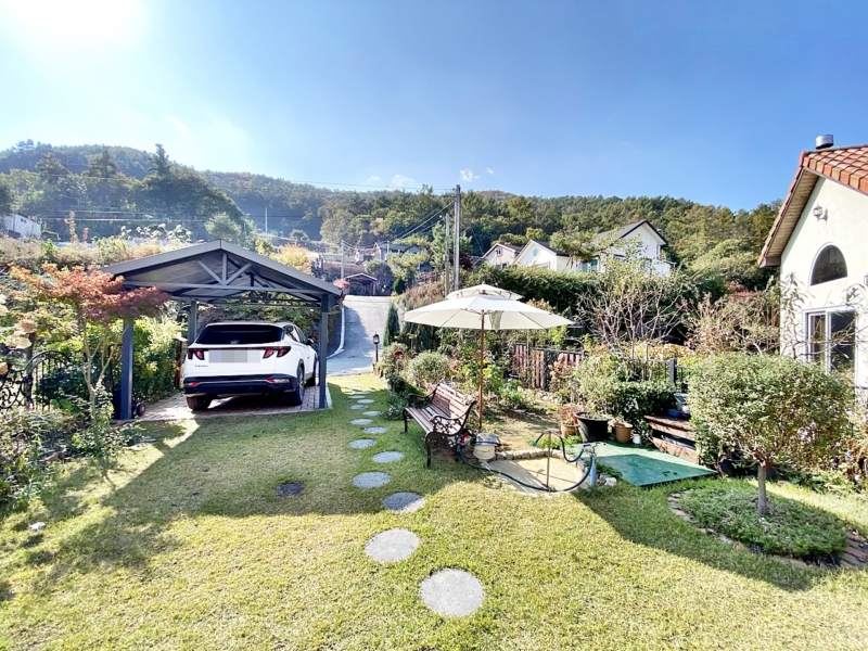 주택 앞면으로 잔디 마당과 비가림막된 차고 공간 있으며,