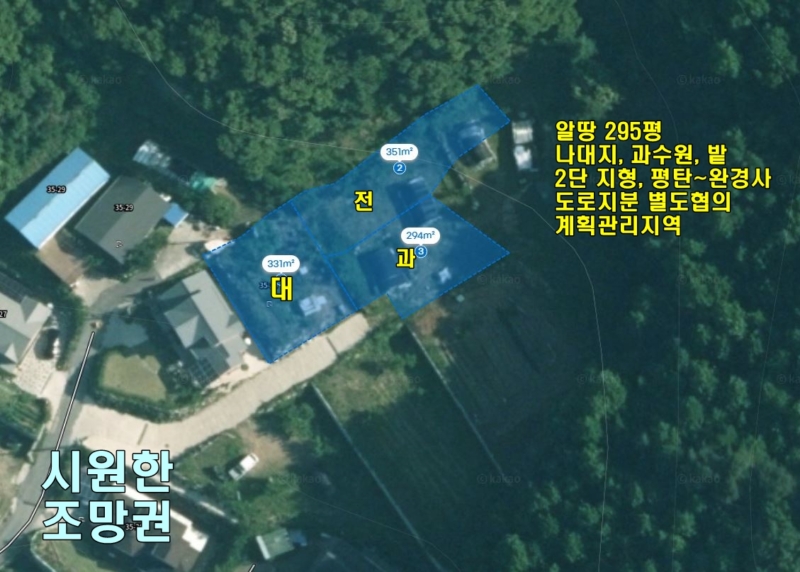 전체적으로 남서향이며 마을 내려다보는 트인 전망,계획관리지역, 2단 지형