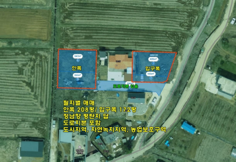 정남향이며 평탄지 전망,주변 집단화 농지로 이루어져 있음​,도시지역, 자연녹지지역, 농업보호구역