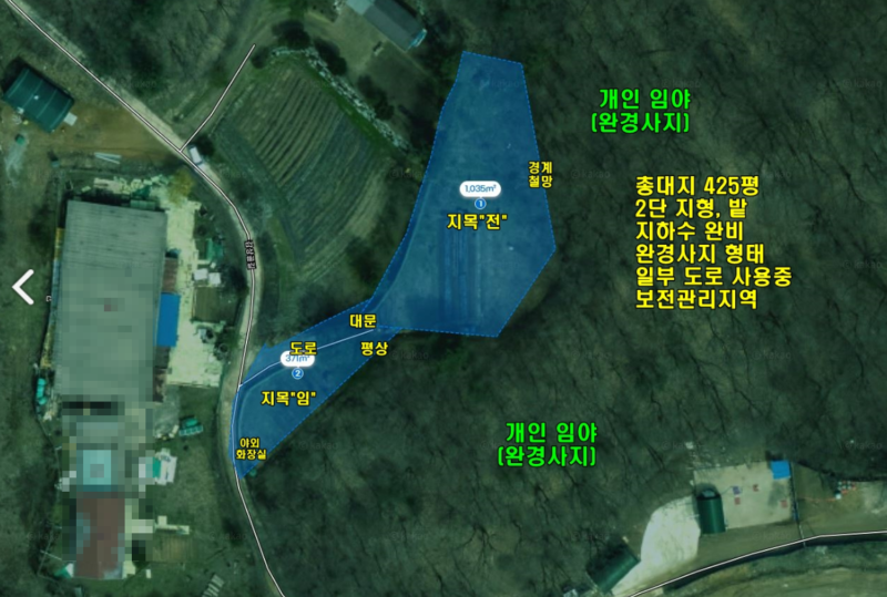 | 간략설명 | 남향 또는 서향이며,서향~북서향으로 낮은 임야능선 바라보는 트인전망 보전관리지역, 2단 지형,2공간으로 분리되어 밭으로 사용중,입구경계 철재휀스 설치되어 있음 뒤쪽 임야접한부분은 낮은 철망 설치되어 있음,지하수 설치되어 있음, 수돗가 있음 도로쪽 텃밭 아래쪽에 이동식 야외화장실 있음,4m 포장도로, 마을진입로 대부분 사도로 필지일부 현황 도로부지로 사용중,2차선도로 가까운 계전리 마을에 자리잡은 농지 주변 완경사지 낮은지형의 임야 접해 있음,2차선도로 약 390m 거리,버스정류장 약 820m 거리 개군면사무소 및 생활권 약 4.4km |