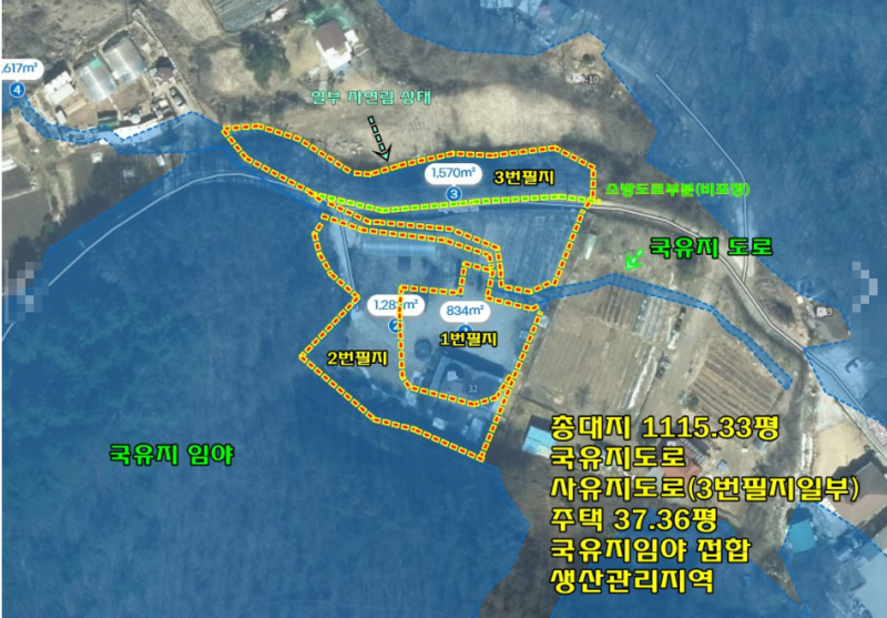 | 간략설명 | 대지834㎡(252평)+전2853㎡(863평),총면적 중 현황도로로 사용되는 면적있음. 북동향을 바라보는 조망권,2005년도 준공된 ALC 구조의 주택, 현재 소유주 거주 중 연면적: 37.36평,단층주택(방3개, 거실+주방, 욕실2개, 다용도실), 목재, 벽지, 마루, 이중창 리모델링하면서 단열에 신경을 많이 쓰셨다고 하며, 다방락있음. 생산관리지역 제작년경 1.2억들여 리모델링하심, 보일러배관, 바닥다시공사, 썬룸20평 부지가 넓어 전체적으로 넓은 마당과 밭이 시원한 느낌을 줌 연못과 정자, 아로니아 80주, 매실 15주, 밤나무와 배나무 등이 심어져 있음 정화조 / 개별지하수 / 일반 전기, 태양광 전기 / 기름보일러, 심야전기보일러 조경석 / 주차장 포장, 마당 잔디, 텃밭 / 주택경계 휀스 쳐져 있음 국유림접합, 4m 아스콘포장도로 / 국유지도로/ 일부 4m 비포장도로/ 청운면생활권5.3km(차량6분) |