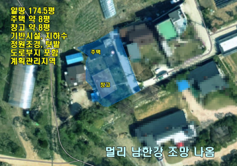 | 간략설명 | 남향으로 평탄지 전망이며 멀리 남한강 조망이 보임,2층 건축시 남한강 조망 시원하게 나올듯함. 계획관리지역, 평탄지,가건물 2채 신고없이 10년이상 사용하고 계시다고함. 기반시설 모두 갖춰진 농막주택,정화조, 전기, 2채 공동지하수 200M 대공 지하수는 옆집 지인분이 설치해놓은 지하수를 연결해서 사용중,상수도 연결가능지 필요시 설치되어 있는 물품들 다 줄수있다고 하심,주택부분은 약 8평 ( 소유자분이 알려주신 평수 ) 방1개, 거실겸 주방, 욕실 1개, 전기판넬,창고부분 약 8평 (대략적인 평수) 거실 겸 창고 ( 거주가능, 전기판넬 ),평탄지 기본조경, 야외 수돗가, 텃밭, 잔디정원 , 소나무 조경수 4M 시멘트 포장도로, 사도, 도로부지 해당필에 포함되어 있음 6번 국도에 가까운 마을로 남한강 조망이 나오는 마을 6번 국도 4차선도로 및 버스정류장 약 840km 거리,지하철 오빈역 약 2.5km 거리 양평읍사무소 및 양평읍생활권 약 3.7km |