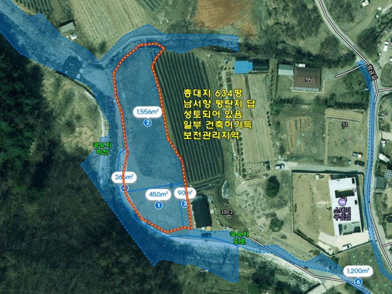 남향, 답2096㎡(634.04평), 국유지 점용 사용중, 남서향으로 항금천과 야산 조망