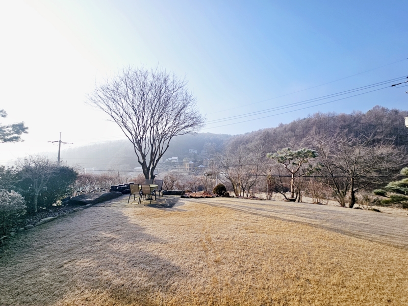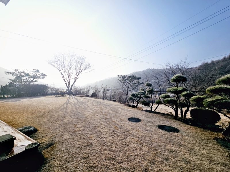 - 경계석축, 잔디, 단풍나무, 소나무조경, 데크위 지붕시공, 가마솥, 야외수도, 외부창고