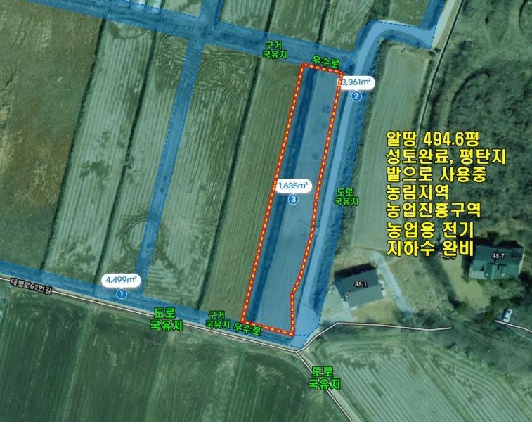 | 간략설명 | 남향, 답1635㎡(494.59평), 경지정리된 농지, 성토완료, 평탄지, 밭으로 사용중, 농업용전기/지하수 2차선도로 및 버스정류장 310m, 지하철 지평역 약 6.5km, 지평면 생활권 약 6km |