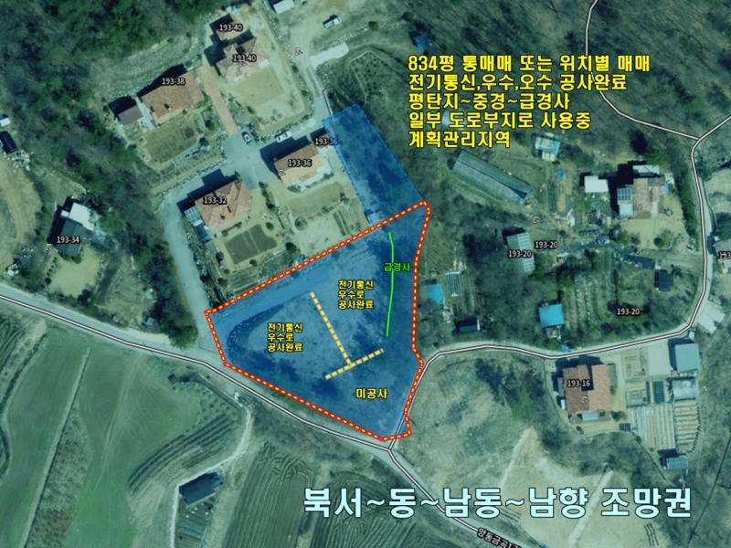 | 간략설명 | 남향, 임2758㎡(834.3평), 일부 토목, 일부 자연림상태, 전기/통신 지중, 오수관 배관공사 - 2차선도로 260m, 버스정류장 2.5km, 동양평IC 톨게이트 4.7km, 양동역 및 양동면사무소&생활권 6.2km |