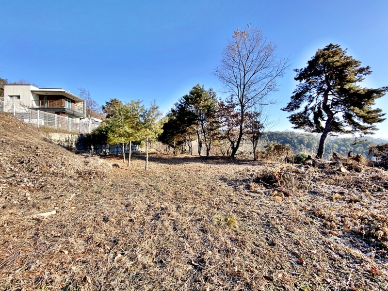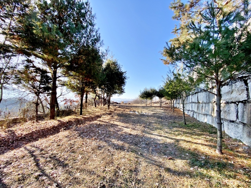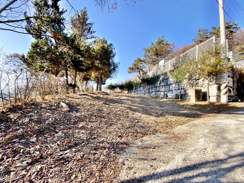 - 남동향으로 내려다보는 조망, 남서향으로 멀리 남한강 조망 나옴, 평탄화 완료/필지 경계로 수목 식재
