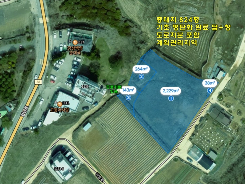 | 간략설명 | 남향, 답2410㎡(729평), 창264㎡(79.86평), 도로지분49.6㎡(15평), 버스/2차선도로 200m, 편의시설1.5km, 보강토 성토 및 기초 평탄화 토목완료, 지목상 답+창이나 성토하여 도로레벨과 높이 같음 |