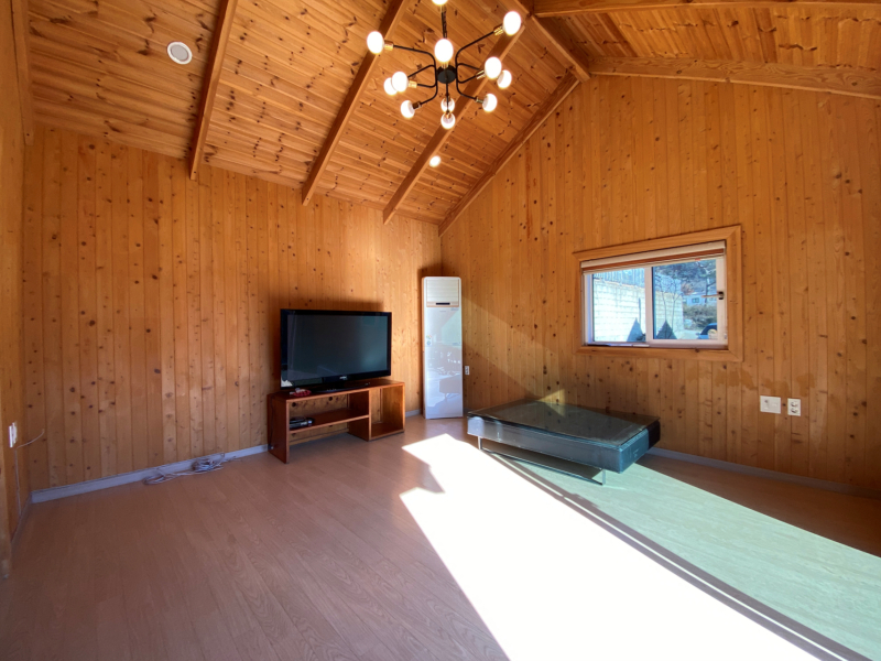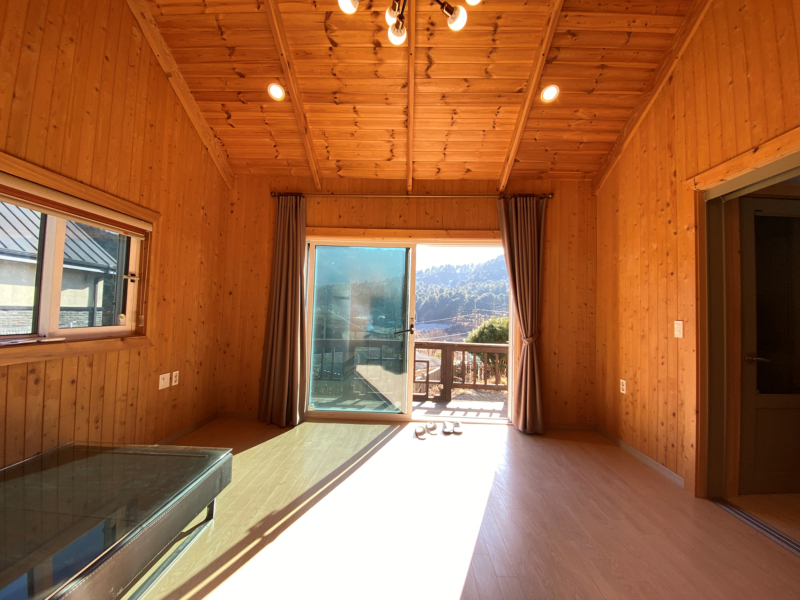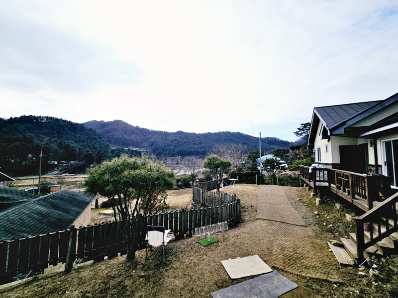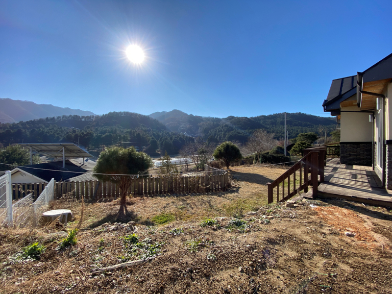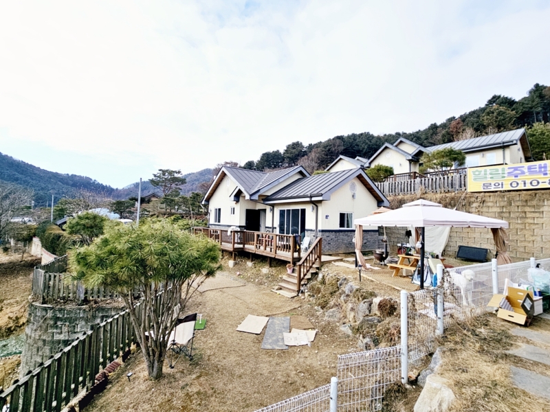 2018년 준공, 목조주택, 17.56평, 공동지하수, 오수관, 황토 구들방, 잔디, 소나무, 수도, 경계휀스