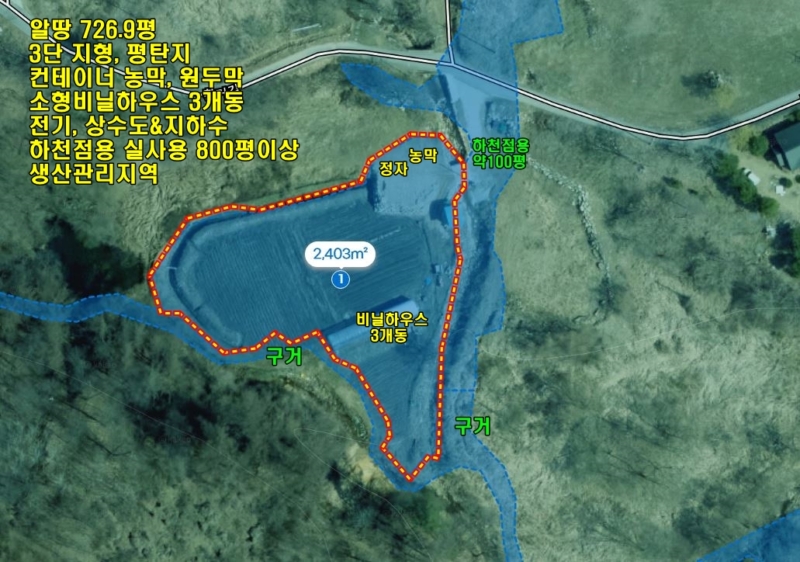 | 간략설명 | 남향, 답2403㎡(726.91평), 하천점용 약100평 (1년 약2만원), 3단 지형/평탄지, 컨테이너농막, 비닐하우스 3개동 주말농장으로 사용중, 원두막 1동, 상수도 및 지하수 겸용, 버스/2차선도로 3.6km, 편의시설 8.5km |