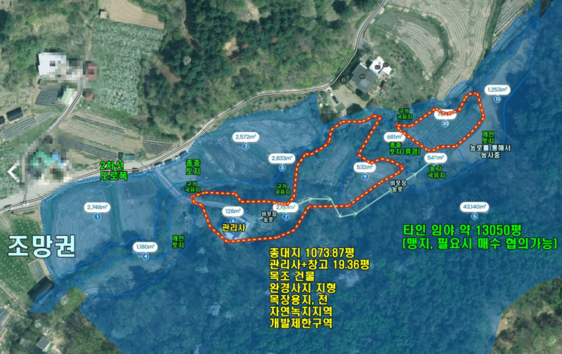 | 간략설명 | 건물은 북서향이며 부지 전망은 남서~서~북서향으로 나옴,남서향으로 멀리 강조망이 조금 보임 2014년 준공, 목조건물, 2개동 창고&관리사동,실제 주거용 1개동 19.36평 (가동 창고 9.68평, 나동 관리사 9.68평) 건축물대장상 가동,나동으로 구분되어 있으나,실제 한개의 주택공간으로 사용중 직접 농사 짓고 있음,기름보일러, 정화조, 개별 지하수 도시지역, 자연녹지지역, 개발제한구역, 상수원보호구역 , "ㄱ" 구조의 데크 썬룸 시공됨 방2개, 거실, 주방, 욕실1개,2차선도로 -> 4m 포장도로, 종중+구거 현황도로 해당필지 일부 현황도로 부지로 사용중,안쪽에 있는 일부 타인토지 맹지들이 해당필지 일부를 오랫동안 농로로 사용해오면서 농사를 짓고계심,양수1리 마을 한쪽임야에 접한 부지 2차선도로 50m 거리, 버스정류장 750m 거리,지하철 양수역 2.2km 거리 양서면사무소 및 양서편의시설생활권 약 2.8km |