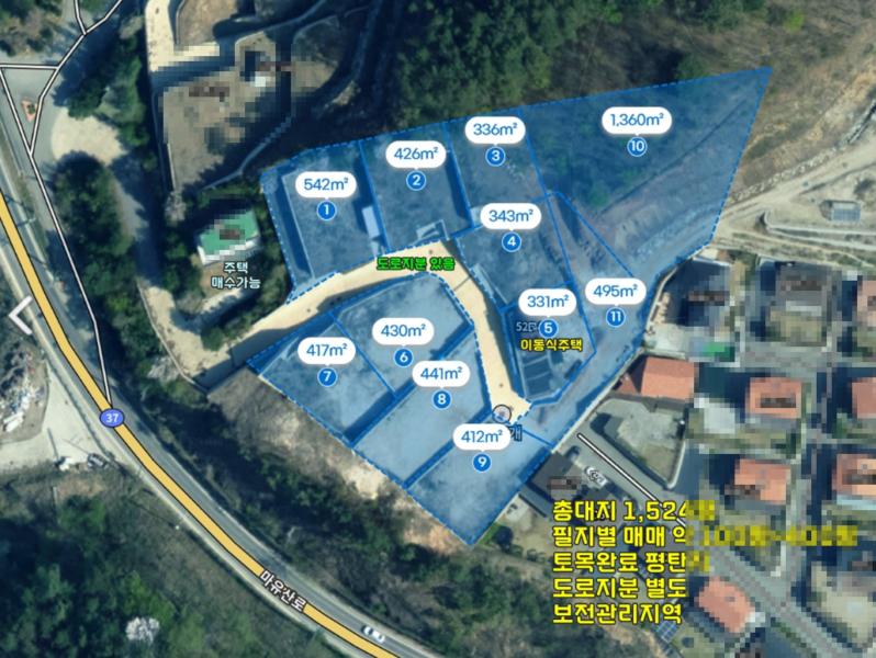 | 간략설명 | 필지 위치에 따라 남동향~남서향,보전관리지역 기초토목완료 평탄지 임야,일부 주차박스 설치되어 있음,전기/통신 지중화 단지, 접한도로 오수 맨홀 있음 5M 시멘트 포장도로, 사도,도로지분 주신다고 하시니 최종 계약시 확인 바람 37번 국도 140m, 버스정류장 630m 거리,옥천면 생활권 2.2km, 양평 IC 5.3km 거리 |