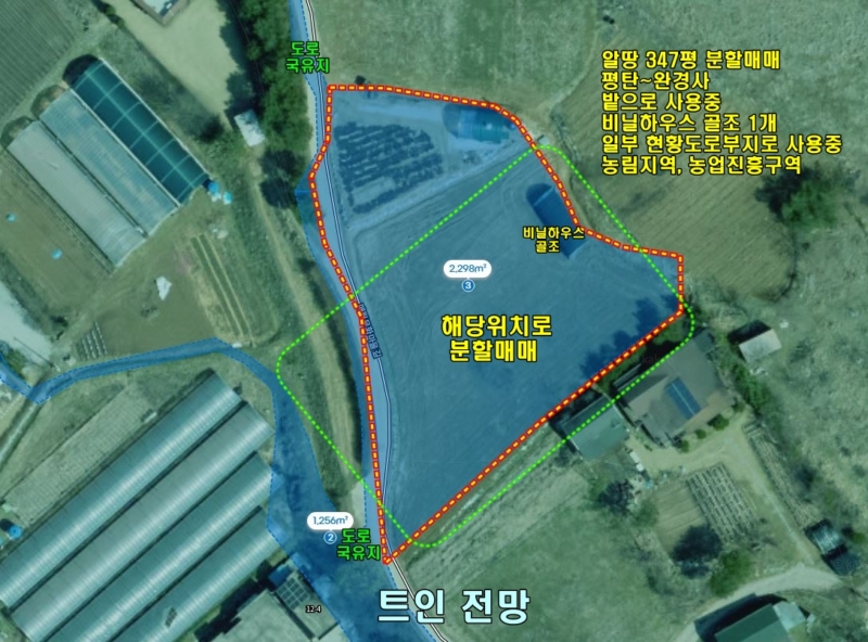 위성 위치 상 아래쪽,구매자가 원할 경우 하우스 1동 철거 가능, 필요 시 그대로 사용 가능