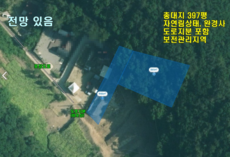 | 간략설명 | 북서향이며 정면 산능선 사이로 내려다보는 전망 있음,보전관리지역, 자연림상태 진입로 일부 평탄지 ~ 부지 대부분 완경사,4m 포장도로 -> 비포장도로 진입로, 도로지분 보유 용문면 망능리 ~ 단월면 향소리를 잇는 2차선도로 인근에 자리잡은 마을,2차선도로 480m 거리, 버스정류장 530m 거리 용문면사무소 8.6km, 용문시내생활권 9.2km, 지하철 용문역 9.5km |