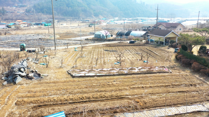 차고 양옆으로 10넘은 배나무와 복숭아나무 등 유실수 식재, 밭에도 다양한 유실수 가득함