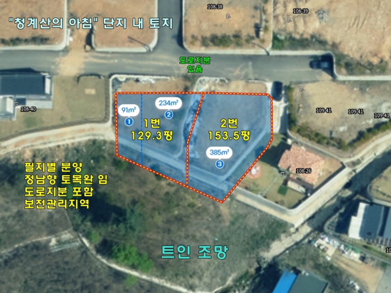 | 간략설명 | 정남향으로 트인 조망,보전관리지역, 기초토목완료된 평탄지 임야로,별도 기반시설은 없음 1번필지 : 69-55임 + 69-30임,알땅 98.3평 + 도로지분 31평 = 분양 129.3평, 필요시 1필지로 합필해주신다고 함 2번필지 : 69-31임,알땅 116.5평 + 도로지분 37평 = 분양 153.5평,6M 아스팔트 포장도로, 사도, 도로지분 있음 소유자 인근 토지 여러필지 보유하여,정확한 도로지분 면적 계약시 확인바람 청계산의 아침 단지 내 토지,2차선도로 1km, 경의중앙선 국수역 5km, 양평 TG 5.8km 옥천면 생활권 7.4km, 양서면 생활권 14km 거리 |