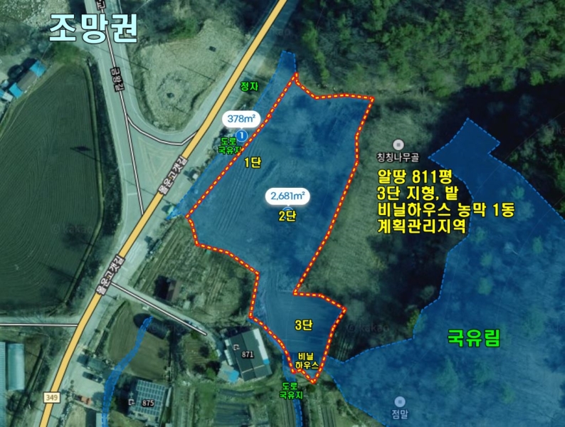 | 간략설명 | 전체적으로 남서향으로 건축하는게 좋아보이며,대로변쪽 전망은 북서향으로 나옴 계획관리지역, 평탄~완경사지,3단 지형의 밭, 비닐하우스형 농막 1동 있음 현재 동네 주민이 농사를 대신 짓고 계심,특별한 기반 시설은 없어 보임 2차선 도로 접해 있음, 금왕1리 마을내 지방도 2차선도로 삼거리에 위치한 토지 버스정류장 약 280M 거리, 금왕보건소 2약 .6KM 거리, 양동면사무소 및 기차 양동역 약 8KM 거리 |