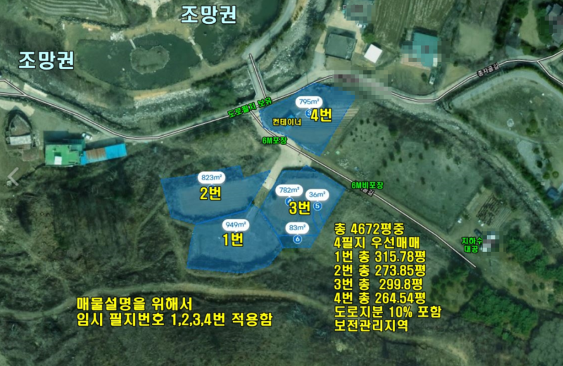 | 간략설명 | 필지위치에따라서 건축 방향이 조금씩 다르며,전체적으로 전망은 북서~북~북동향을 바라보는 전망임 보전관리지역, 계단식 평탄지로 택지조성완료 ,소규모 단지로 석축 토목공사완료 도로부지에 기본적으로 우수관 매설공사되어 있음,4M 마을도로 -> 해당부지내 4~6M 포장도로, 일부 비포장 해당단지 마을도로 입구 도로필지 단독보유,분할매매시 필지별 약 10% 도로지분 적용 외지인 위주로 형성된 성덕리 마을 안쪽 국유림 인접한 토지,2차선도로 및 버스정류장 약 1.4km 필지아래 성덕천과 연결되는 하천 접해있음,강하면사무소, 강하체육공원, 강하시내 편의시설 생활권 약 4.4km |