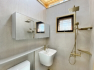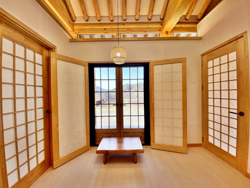 거실 석가래/ 골조 소나무 육송/ 외부 친환경수성도장,창호 3중저방사단열유리/ 내부 편백루바​/ 욕실 한샘도기​