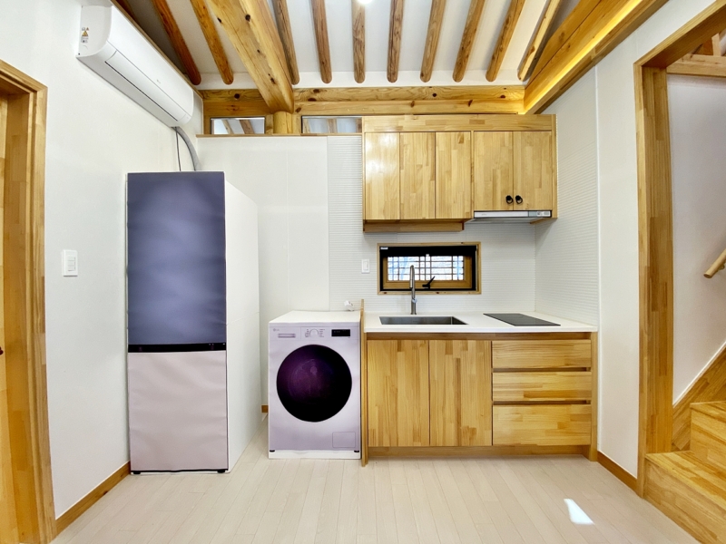 1.5룸 스타일로 거실 한쪽에 주방 설치되어 있음, 방 안쪽에 행거 설치된 작은 공간 있음