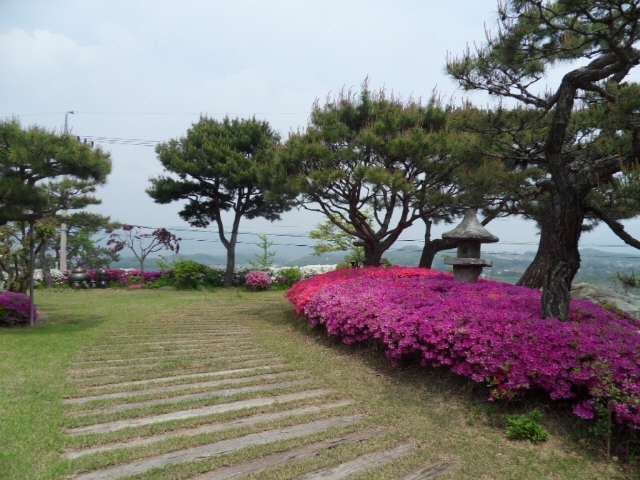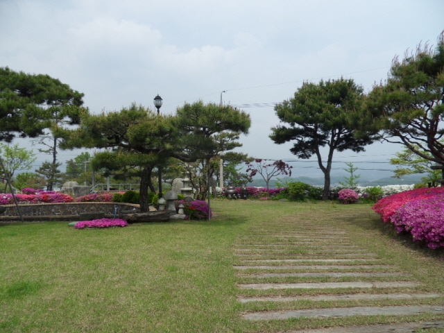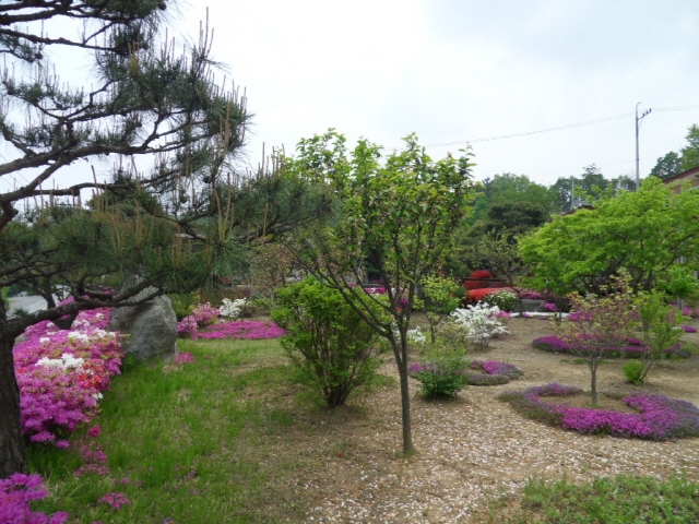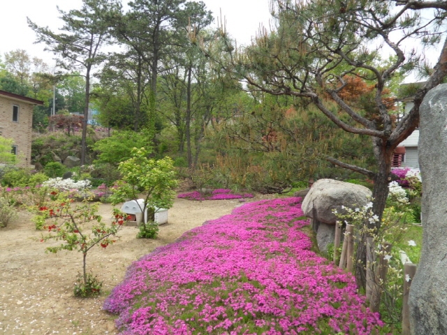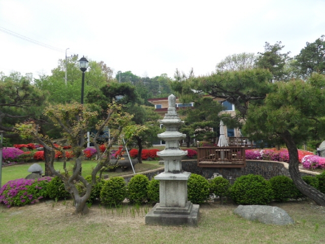 고가의 소나무 10그루 이상 식재, 자연석과 돌탑 조경, 인공 연못에 연결된 넓은 데크 설치