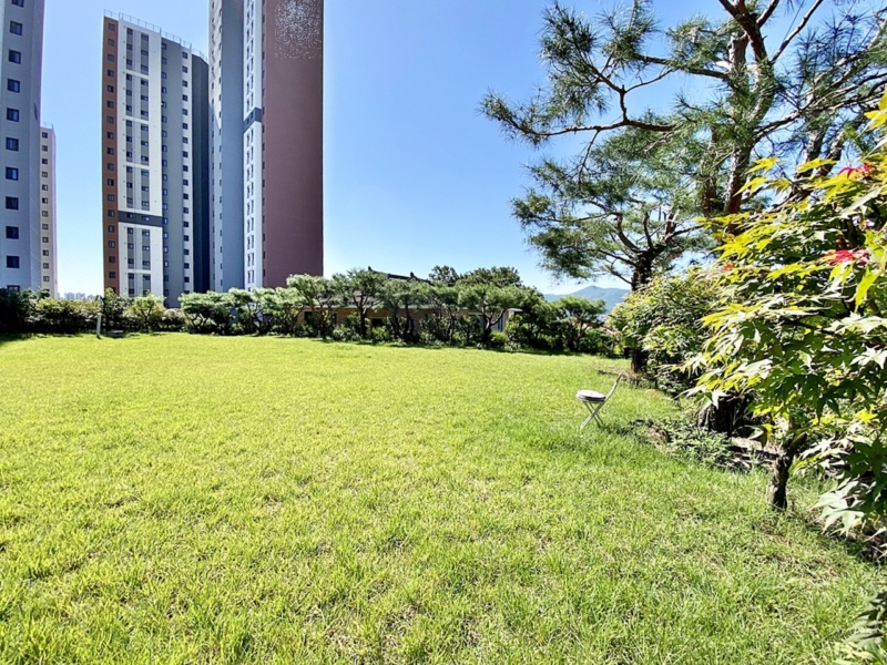 잔디마당, 디딤석,​조경석, 조경수, ​데크+난간, 야외 테이블,도시가스, 상수도, 개별정화조​