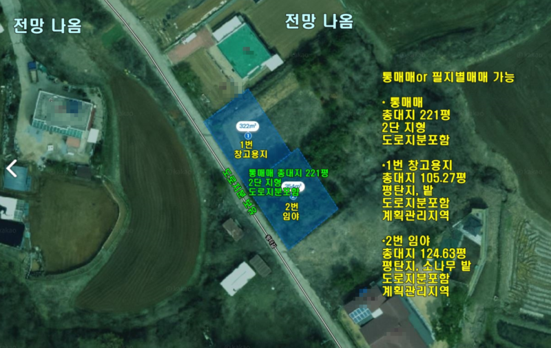 | 간략설명 | 남서향 평탄지 전망,주변 농경지로 비교적 트인 전망,계획관리지역, 평탄지, 임야 토목공사하고 원상복구로 택지조성된 임야, 경계 정원수로 쓸만한 소나무 식재되어 있음 도로 경계 석축공사되어 있음,접한도로보다 지대가 살짝 높음 4M 포장도로, 도로지분 보유,개군저수지 인근에 형성된 토지 2차선도로 약 230M 거리, 버스정류장 약 430M 거리,개군면소재지 생활권 약 2.9KM 거리 |