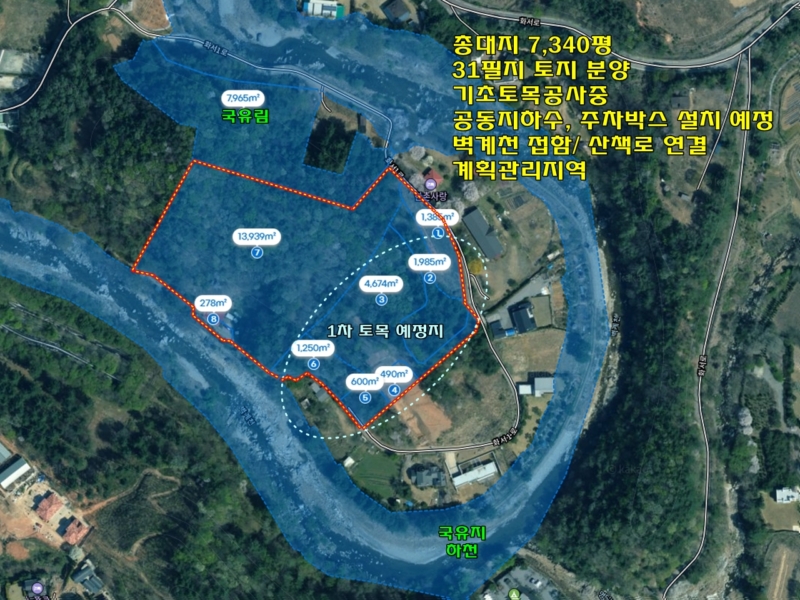 | 간략설명 | 남동향 부정형 임+전+답, 벽계천이 둘러싸고 있는 형태의 토지로 단지에서 벽계천변 산책로로 연결하실 예정이라고 함,벌목완료 및 기초 토목공사 중으로 매그넘스톤 보강토 블럭, 주차박스 시공예정이라 함,단지 내 도로 6~8M로 시공예정이며, 공동지하수 설치 및 단지 내 도로까지는 전기 지중화해주신다고 함 필지별 면적 1번 : 알땅 673m2 (203평)/ 도로지분 114m2/ 분양 787m2 (238평) 2번 : 알땅 492m2 (149평)/ 도로지분 83m2/ 분양 575m2 (174평) 3번 : 알땅 539m2 (163평)/ 도로지분 91m2/ 분양 630m2 (191평) 4번 : 알땅 530m2 (166평)/ 도로지분 90m2/ 분양 620m2 (187평) 5번 : 알땅 595m2 (180평)/ 도로지분 101m2/ 분양 696m2 (210평) 6번 : 알땅 582m2 (176평)/ 도로지분 98m2/ 분양 680m2 (206평) 7번 : 알땅 496m2 (150평)/ 도로지분 84m2/ 분양 580m2 (175평) 8번 : 알땅 592m2 (179평)/ 도로지분 100m2/ 분양 692m2 (209평) 9번 : 알땅 592m2 (179평)/ 도로지분 100m2/ 분양 692m2 (209평) 10번 : 알땅 661m2 (200평)/ 도로지분 112m2/ 분양 773m2 (234평) 11번 : 알땅 661m2 (200평)/ 도로지분 112m2/ 분양 773m2 (234평) 12번 : 알땅 661m2 (200평)/ 도로지분 112m2/ 분양 773m2 (234평) 13번 : 알땅 661m2 (200평)/ 도로지분 112m2/ 분양 773m2 (234평) 14번 : 알땅 713m2 (216평)/ 도로지분 121m2/ 분양 834m2 (252평) 15번 : 알땅 735m2 (222평)/ 도로지분 124m2/ 분양 859m2 (260평) 16번 : 알땅 595m2 (180평)/ 도로지분 101m2/ 분양 696m2 (210평) 17번 : 알땅 595m2 (180평)/ 도로지분 101m2/ 분양 696m2 (210평) 18번 : 알땅 595m2 (180평)/ 도로지분 101m2/ 분양 696m2 (210평) 19번 : 알땅 595m2 (180평)/ 도로지분 101m2/ 분양 696m2 (210평) 20번 : 알땅 496m2 (150평)/ 도로지분 84m2/ 분양 580m2 (175평) 21번 : 알땅 661m2 (200평)/ 도로지분 112m2/ 분양 773m2 (234평) 22번 : 알땅 496m2 (150평)/ 도로지분 84m2/ 분양 580m2 (175평) > 매매완료 23번 : 알땅 595m2 (180평)/ 도로지분 101m2/ 분양 696m2 (210평) 24번 : 알땅 595m2 (180평)/ 도로지분 101m2/ 분양 696m2 (210평) 25번 : 알땅 1,147m2 (347평)/ 도로지분 194m2/ 분양 1,341m2 (406평) > 매매완료 26번 : 알땅 660m2 (200평)/ 도로지분 112m2/ 분양 772m2 (233평) > 매매완료 27번 : 알땅 588m2 (178평)/ 도로지분 99m2/ 분양 687m2 (208평) > 매매완료 28번 : 알땅 600m2 (181평)/ 도로지분 101m2/ 분양 701m2 (212평) > 매매완료 29번 : 알땅 490m2 (148평)/ 도로지분 83m2/ 분양 573m2 (173평) 30번 : 알땅 2,355m2 (712평)/ 도로지분 0m2/ 분양 2,355m2 (712평) 31번 : 알땅 993m2 (300평)/ 도로지분 0m2/ 분양 993m2 (300평) > 매매완료 현재는 4M 아스콘 포장도로, 현황도로,도로폭 6~8M로 확장예정, 사도, 도로지분 있음 2차선도로 470m, 버스정류장 500m 거리,서종면 생활권 12km, 서종 IC 9.6km 거리 |
