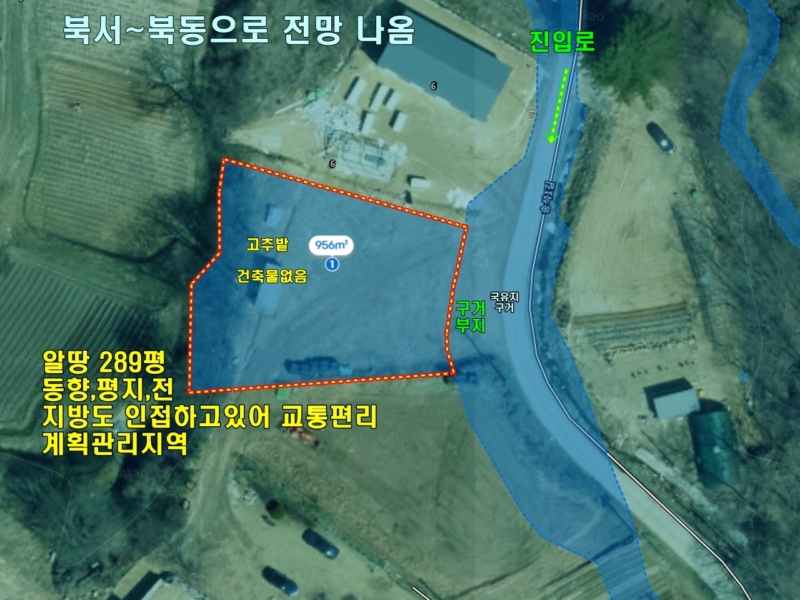 | 간략설명 | 남향 및 동향 건축가능하며,전망은 북서~북동으로 나옴 계획관리지역, 평탄지에가까운 완경사지,밭으로 사용중, 일부 고추밭 도로접한부분 구거부지여서 서비스 야외주차공간있음,4m 포장도로, 구거 국유지, 현황도로 지방도 100m, 버스정류장 296m,동양평 톨게이트 2.5km, 양동면 생활권 4.1km 양동역 경의중앙선 4.2km |