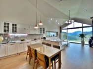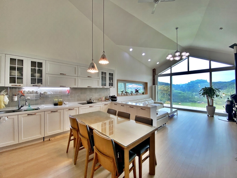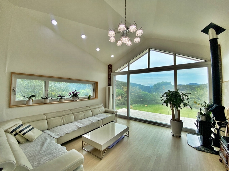 거실은 박공지붕 형태를 살린 복층형 구조로 층고가 높고,통창으로 채광 및 조망 우수함