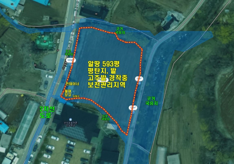 | 간략설명 | 평탄지 남향이며 동~남동향으로 전망 있음,보전관리지역, 평탄지, 밭 고추밭으로 재촌자경중,필지내 컨테이너 1동 있음,( 필요시 주거나 철거 가능하다고함 ) 농사용 지하수 있음 (물탱크 및 범프시설 있음)상하수도 연결가능지 2차선도로 접해있음, 공도로,앞에 산수유농어촌 인성학교 있음 개군저수지 인근, 산수유마을에 위치한 토지,버스정류장까지 약 120m 개군면 생활권까지 약 4.4km |