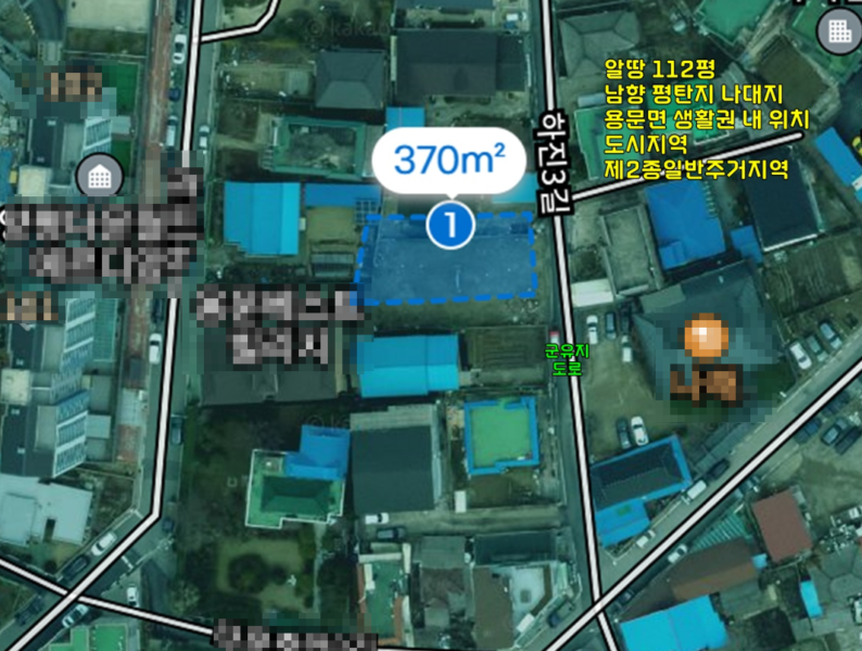 | 간략설명 | 평탄지 남향이며 앞뒤 건물에 전망가림, 도시지역, 제2종일반주거지역,옛날 농가주택 철거된 나대지 수풀 조금 자란 상태,상수도, 오수관로 연결가능지, 4M 아스콘포장도로, 공도,접한도로와 지대가 같음 용문면소재지 주택밀집지역내 나대지,다문초 250m, 용문역 600m 거리 |