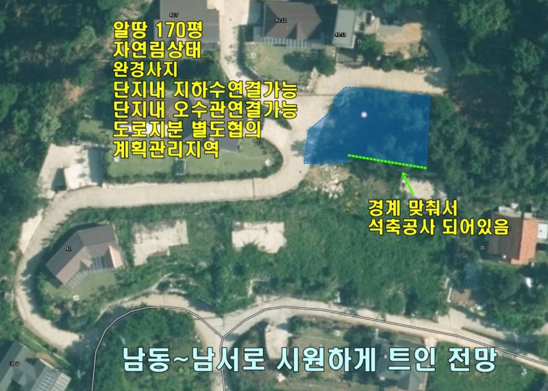 | 간략설명 | 남향이며 전망은 남동~남서향으로 시원하게 트인전망,계획관리지역, 자연림 상태 중경~급경사지 임야,접한 도로보다 지대가 낮음,단지내도로 코너토지 단지내 130m암반수 공용지하수 연결가능,단지내 도로에 오수관 매설되어 있음 단지내 4~5m 아스콘포장도로, 도로지분 별도협의,조현초등학교 인근 마을내 전망 좋은 단지내토지 주변토지 종중임야에 둘러쌓인 단지, 지방도 2차선도로 및 버스정류장 약 530m 거리 |