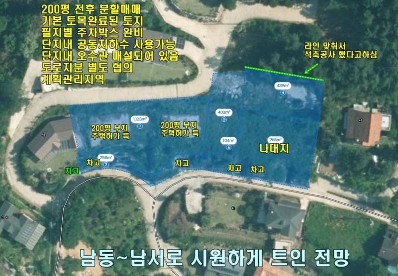 | 간략설명 | 전체적으로 남향이며,전망은 남동~남서향으로 시원하게 트인 전망 계획관리지역, 기본토목공사완료,크게 4개의 택지로 공사되어 있고 4개의 택지에 각각 주차박스 차고 있음,일부 나대지, 일부필지 주택 2채 허가받아져 있음 단지내 130m암반수 공용지하수 연결가능,단지내 도로에 오수관 매설되어 있음 단지내 4~5m 아스콘포장도로, 도로지분 별도협의,조현초등학교 인근 마을내 전망 좋은 단지내토지 주변토지 종중임야에 둘러쌓인 단지,지방도 2차선도로 및 버스정류장 약 500m 거리 |