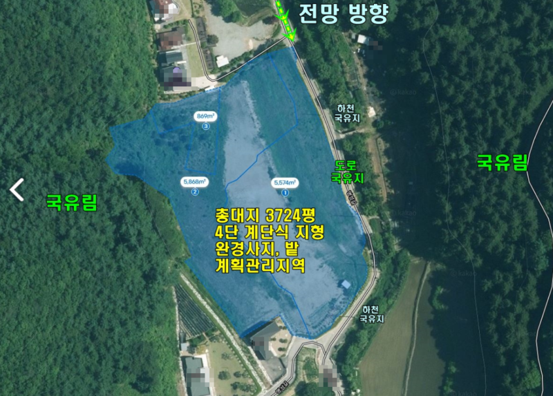 | 간략설명 | 국유림 및 도로 국유지 접해있음,도로 건너편 마을 하천 인접해있음 남향 및 동향으로 건축가능하며 진입로를 따라서 남향 또는 북향으로 나옴 계획관리지역, 평탄~완경사지 ,밭,전체적으로 계단식 4단 지형으로 형성되어 있음 접한도로보다 지대가 높음,단지개발로 건축허가냈다가 취소하시고 매매진행함 4m 아스콘포장도로, 도로 국유지.지방도 및 버스정류장 약 2.3m 대명 비발디파크 & 오션월드 약 7.7km,단월면사무소 소재지 약 14.5km |