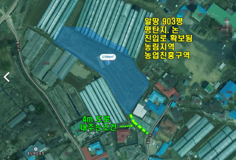 | 간략설명 | 전체적인 방향은 남서향 전망,농림지역, 농업진흥구역,평탄지, 논으로 사용중 주변 비닐하우스 농지에 둘러쌓인 토지 ,정면 아래필지보다 해당토지 지대가 높음 상하수도 연결가능지,마을현황도로 > 174-1대 필지 통해서 4M도로 내주시는 조건 진입로 별도로 도로필지 및 도로지분 협의 ,2차선 도로 및 버스정류장 200m 37번 국도 1.9km 거리,개군면사무소 생활권 약 6km 거리 |