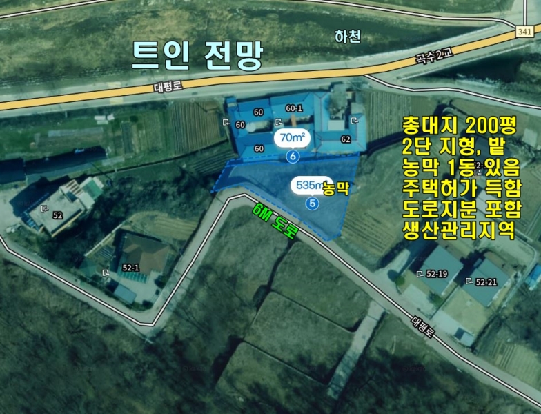 | 간략설명 | 남향 또는 서향 건축 가능하며,전망은 서~북~북동으로 나옴 생산관리지역, 2단 지형, 밭,주말농장으로 사용중 농막 1동 있음 (매매가에 포함이며 철거도 가능함, 전기시설 연결되어 있음 상수도 연결가능지,현재 옆집에서 수도호수 끌어다 사용중 주택 30평 규모로 건축허가 받아져있다고함, 6M 시멘트 포장도로 접해 있음, 도로지분 보유 대평저수지 인근에 자리잡은 택지,지방도 2차선도로 약 130m , 버스정류장 약 670m 양평TPC 골프클럽 3.6km,지평면사무소 생활권 약 6.8km 지평역 약 7.5km |
