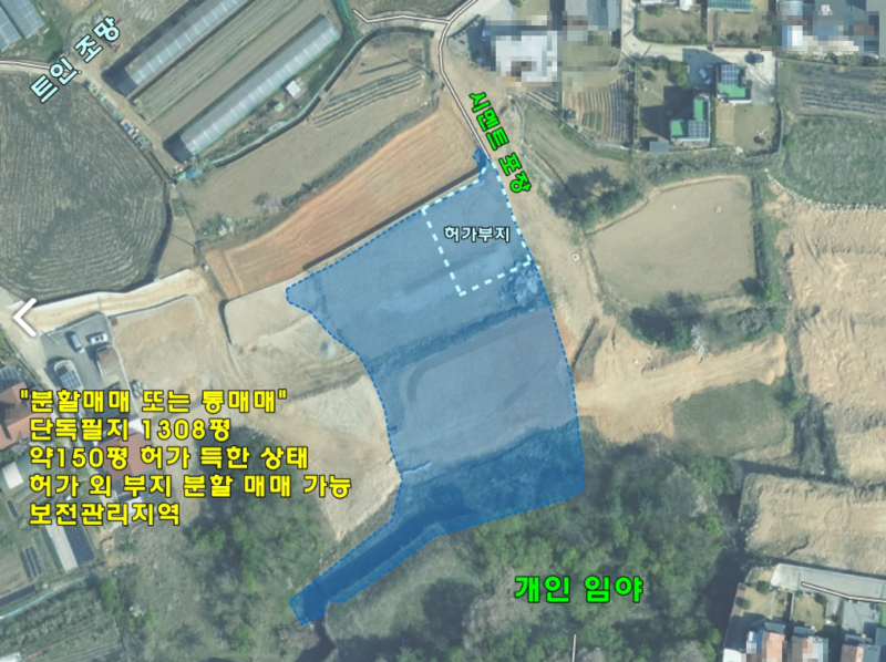 | 간략설명 | 남서향으로 건축 가능하고 북서향을 트인 조망 나옴, 보전관리지역 필지 입구쪽은 보강토 토목 완료 평탄지이며, 전체 필지 가운데 일부 토목이 된것 같으나 수풀이 우거져 확인 필요해 보임 3m시메트 포장, 사도(계약시 도로 지분 확인해 주신다고 함),소규모 전원 마을 내 위치 왕복 2차선까지 약500m거리,옥천면사무소 및 생활권 약 3km거리, 아신역 약 4km거리 참고:전체필지 1308평(평당 120만원)도 매매동시진행, 허가부지외 분할매매가능(평당140만원)