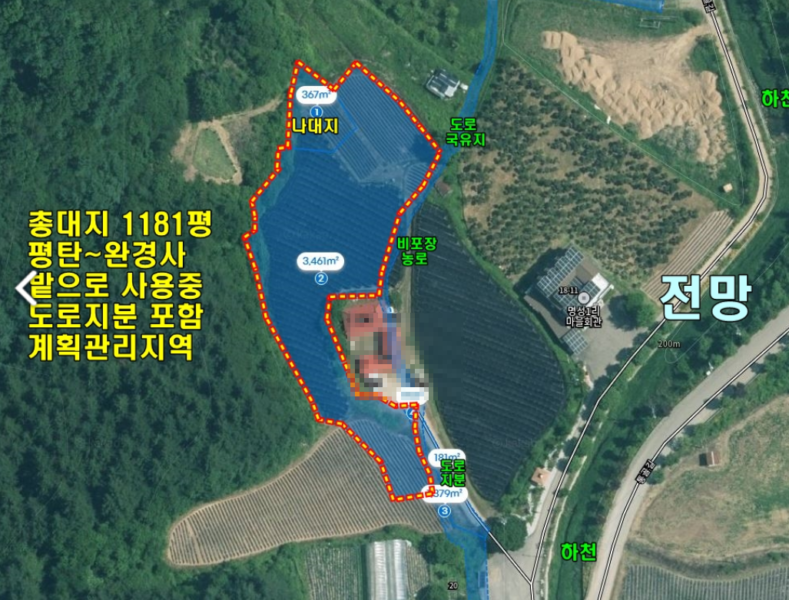 | 간략설명 | 전체적으로 완경사지 남향이며,전망은 북동~동~남동~남으로 나옴 계획관리지역, 평탄~완경사지 지형,밭으로 사용중, 111평 나대지 있음 전체적으로 길쭉한 모양이라,위치에따라서 지형이 조금씩 다름 통매매 희망 하시며 분할매매 협의여지있음,마을 6m 포장도로 > 4m 시멘트포장도로, 도로지분보유 필지안까지는 별도 도로개설 필요함,현재 필지안까지는 옛날부터 사용하던 비포장농로 있음 주변 농림지역 임야 접해있는 토지,마을회관 인근 지방도에 가까운곳에 위치함 명성터널 인근에 자리잡은 농지로 마을과 떨어져있는 토지, 지방도 및 버스정류장 300m 거리 단월면사무소 약 8.3km 거리,대명 비발디파크 약 4.9km 거리 |