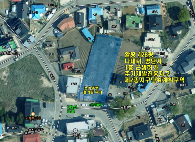 | 간략설명 | 남향, 대1415㎡(428.04평) - 전체적으로 남향이며 평탄지 전망 - 주거개발진흥지구, 제2종지구단위계획구역 평탄지, 나대지, 근생허가 득, 오수관로/상수도 연결가능, 버스 320m, 옥천면사무소 650m, 아신역 2.3km |