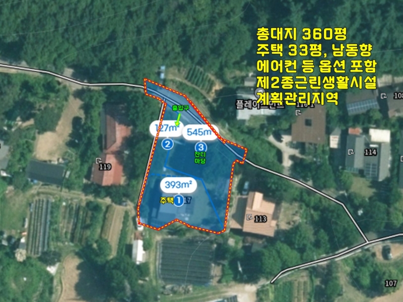 | 간략설명 | 동향, 대647㎡(195.7평). 전545㎡(164.86평) - 2018년 준공, 목조, 0/2층 구조, 주택 111.34㎡ (33.68평) 1층 방 2개, 주방, 화장실 2개, 보일러실, 세탁실, 창고 약10평, 2층 방 1개, 주방, 화장실 1개, 베란다 1개 에어컨, 세탁기, 냉장고, 김치냉장고, 식기세척기 포함 - 목재 데크, 텃밭, 잔디, 야외 테이블 , 화단 경계석 |
