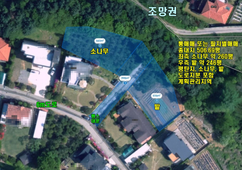 현재 밭은 앞주택 주민이 사용중임,현재 소나무 심어져 있으며 매수자가 원할 경우 매매 의사 있음,