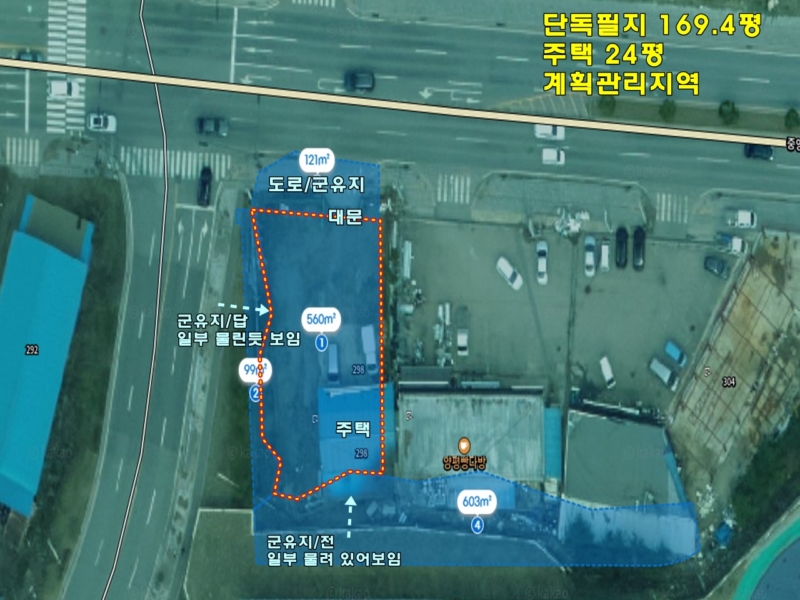 | 간략설명 | 필지 남향이나 출입구가 북향으로 나있으며 ,북향으로 왕복5차선 공도 접함 1994년 준공, 경량철골조, 0/1구조, 단독주택 24.82평,현재 소유자 거주중 상수도, 오수관로, 전기판넬 바닥난방,구조:방2개, 주방, 욕실1개 ,필지 내 경량철골조 약24평의 주택이 있으며 기존 창고건물을 세금 아낄려고 주택으로 용도변경하셨다고 함,경계는 철재 펜스+대문 설치함 필지 북측 출입구 쪽 군유지 도로 접하며, 별도로 도로점용받은건 없다고 하심,약16m 왕복 5차선 /약 12m 왕복4차선, 아스팔트포장, 공도 "양평종합운동장" 초입의 사거리 코너에 위치,버스 정류장 약 200m거리,양평역 약 3km거리 |