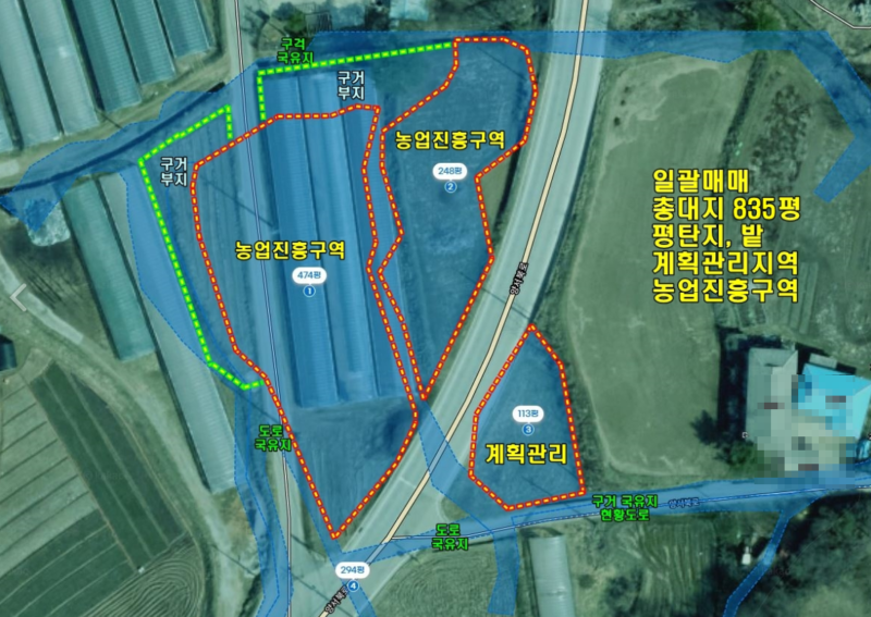 필지별 농업진흥구역, 계획관리지역으로 구분됨 비닐하우스 3개동 ( 2년 임대줬다고하시며 거의 끝나가는것같다고함)