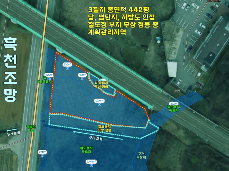 남향의 평탄지, 서측 흑천 영구 조망 확보 (탁 트인 개방감),계획관리지역, 부정형 평탄지