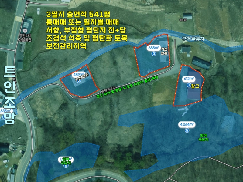 전체적으로 서향, 부정형 평탄지 전+답​​, 보전관리지역​,조경석석축 및 평탄화 토목되어 있으며,